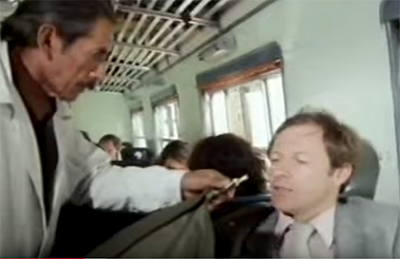 Now, if I had thought hard about the matter it should have occurred to me that an engine driver who borrows a penknife from one of the passengers is not the most likely person in the world to have everything under control, and yet so imbued was I with the European notion that daddy knows best that even then I stood patiently by waiting for the train to go again. But by this time the train was no longer a dominant part of the landscape, charging imperiously through all it surveyed. It had become vegetation. Another derelict machine in that part of the farmyard where derelict machines are laid to rest. Once immobile, it was simply an object round which rural life could flow. A farmer returning home with his small herd of animals (one bullock, one dog, one goat) proceeded under the railway bridge as usual, that is, with great difficulty, and the few remaining passengers set to with a will to help him beat the beasts on their homeward path.