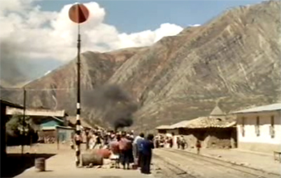 The line out of Lima runs alongside the main road into the hills; buses, cars and lorries have little trouble overtaking the train which never goes much over 30mph. Yet even at that speed the train hoots much of the time, a mournful echoing hoot, which seems to contain more than one note in it though I could never make out if this was because it was a genuine chord or just one strong note with overtones. It hoots because of pedestrians. The Peruvians tend to use the railway line as a private pathway, even to drive their animals along, and at each suspicious bend, or small settlement, or possible crossing, the driver hoots. In the early days of the railway a great many Indians and llamas were killed; nowadays casualties are low and mostly confined to animals who die near the line and are dragged to a position where a court might conceivable hold the railway company guilty.