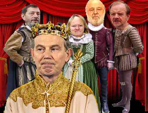 The scene is King Tony’s court at Westminster, where several senior courtiers are awaiting the arrival of the king and discussing their promotion prospects, including Lady Harriet Harman, Milady Mowlam, Lord Tony Banks, Baron Blunkett, etc, with the Duke of Livingstone concealed behind a curtain, listening.