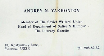 I have Andrey N. Yakhontov’s card before me as I write. He is Head of Department of Satire and Humour of the Literary Gazette in Moscow.