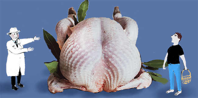 Shopman: Ah monsieur, je regrette, mais nous ne faisons pas le one-man turkey. Nous avons le turkey-leg, le turkeyburger, le rissole de turkey....